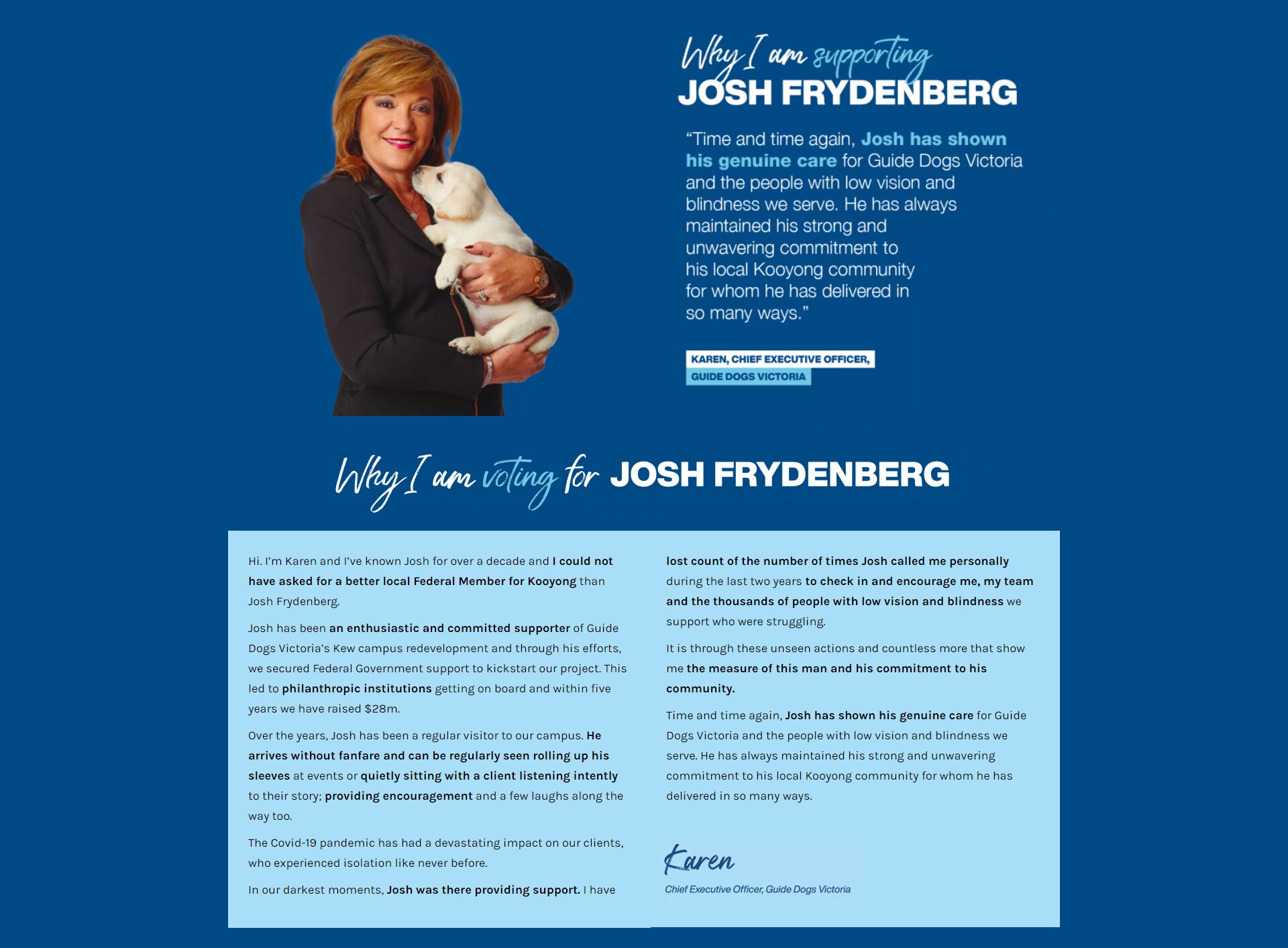 In a pamphlet distributed to Kooyong residents a puppy holding Karen Hayes outlined why she was supporting the Treasurer in his re-election campaign. On April 10 Josh visited Guide Dogs Victoria in Kew for a dinner and tour of the breeding centre kennels and the training centre hosted by Chief Executive Karen Hayes.